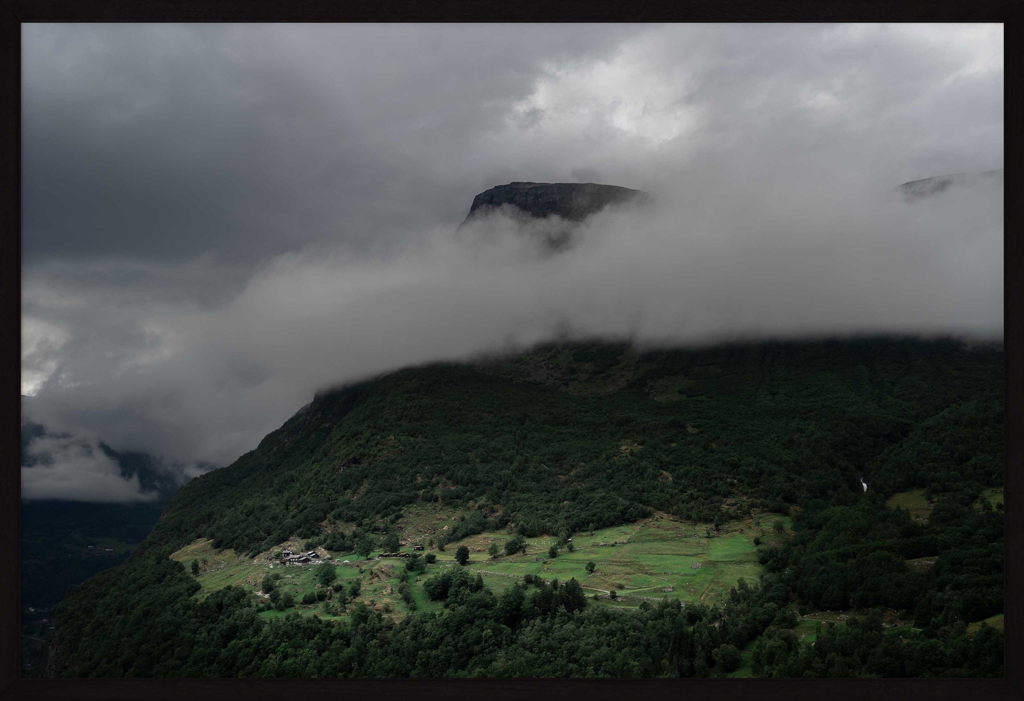 Fotografi av Westerås Gard i Gerianger med nydelige vakre grønntoner og lavt skydekke.