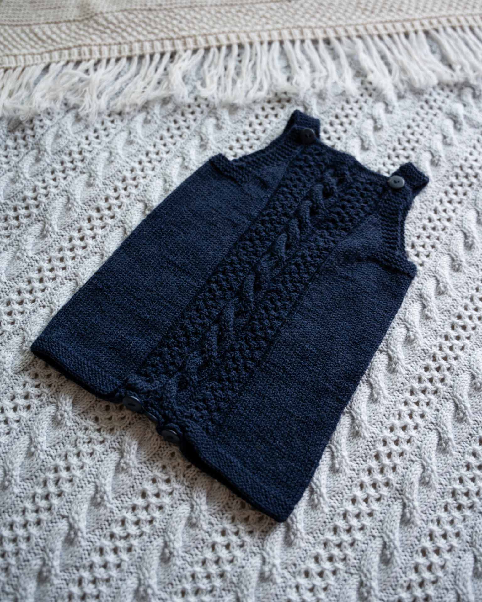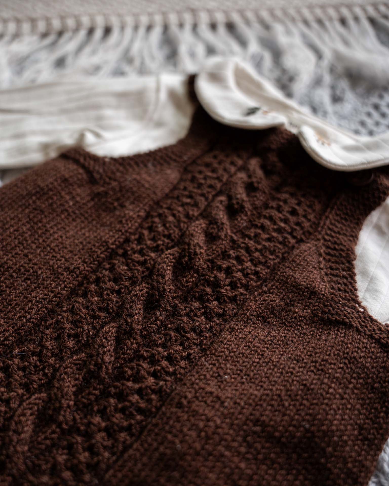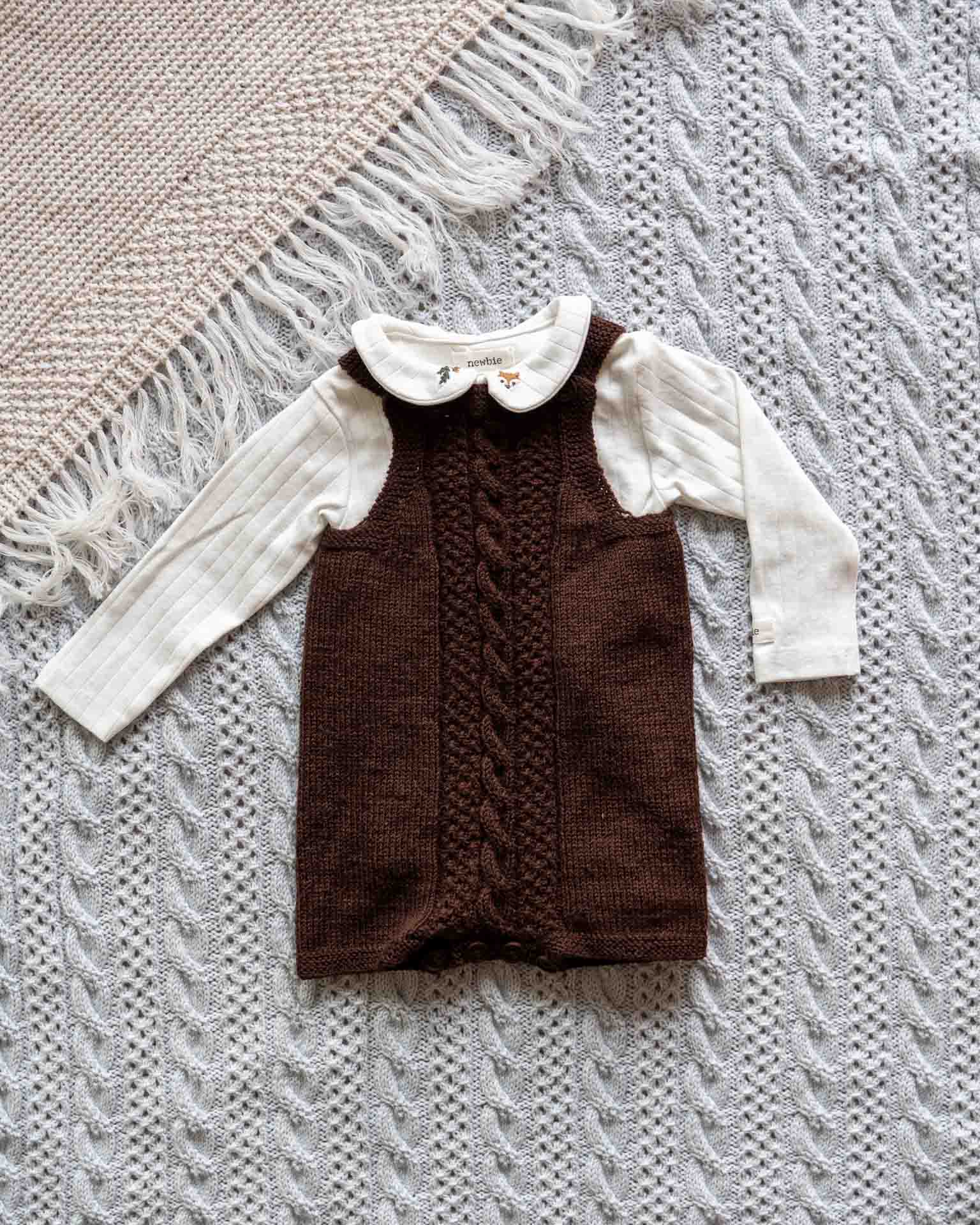 Romperen strikkes ovenfra og ned i en del og har et søtt strukturmønster bestående av fletter og hullmønster på forsiden.