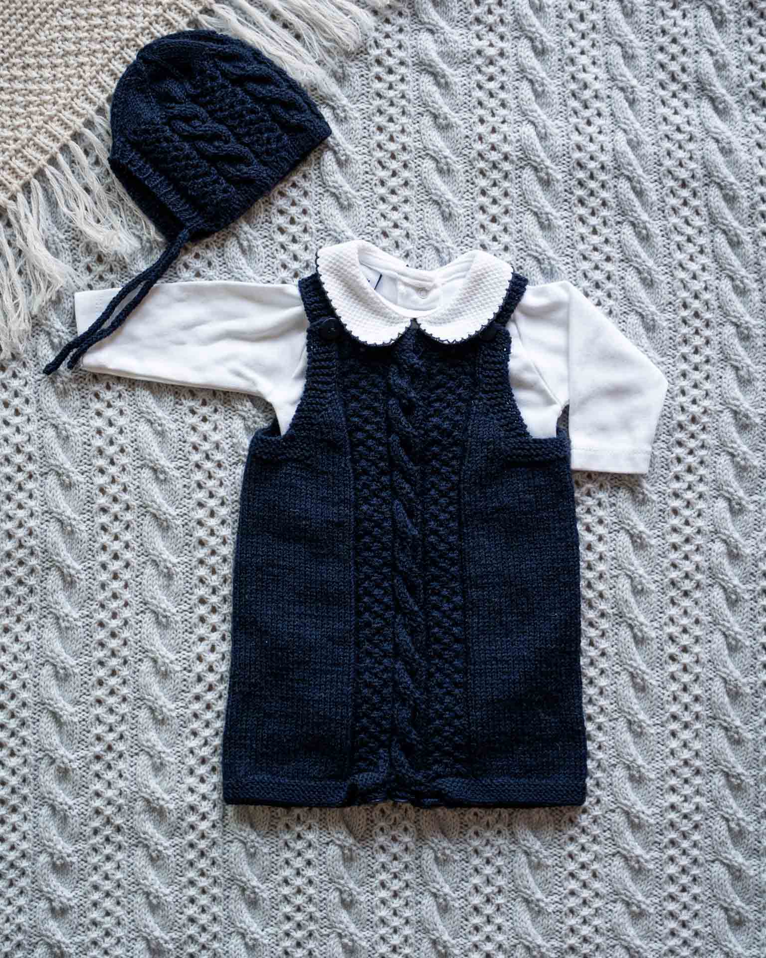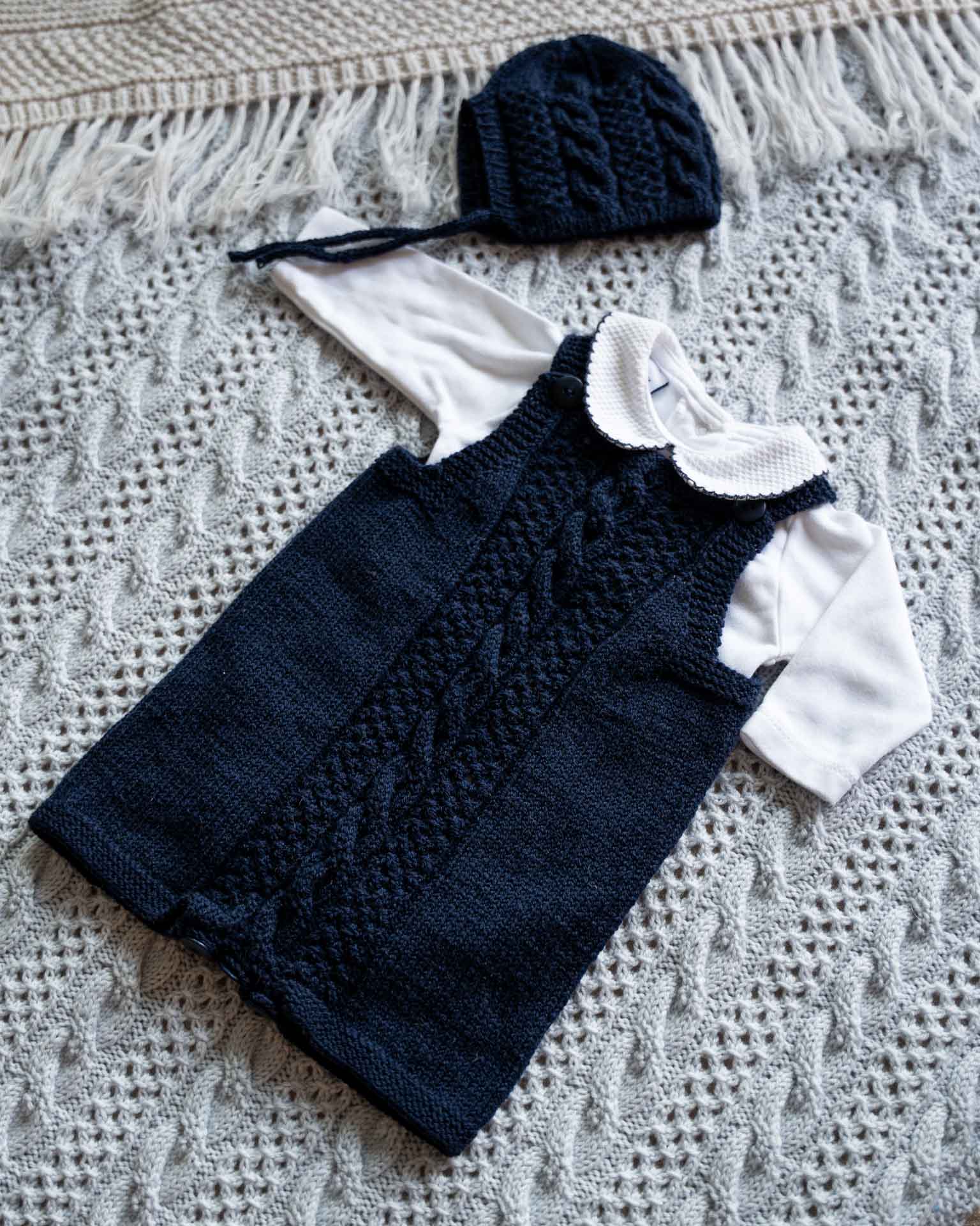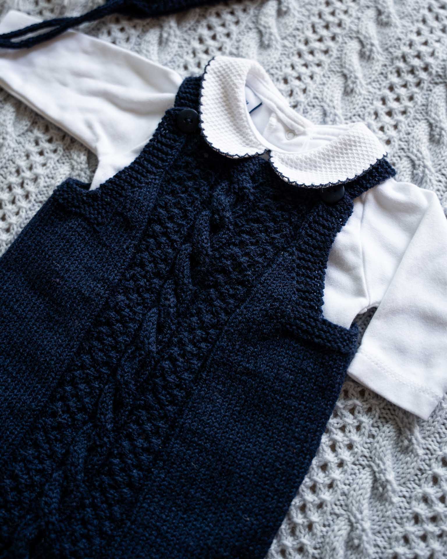 Romperen strikkes ovenfra og ned i en del og har et søtt strukturmønster bestående av fletter og hullmønster på forsiden.