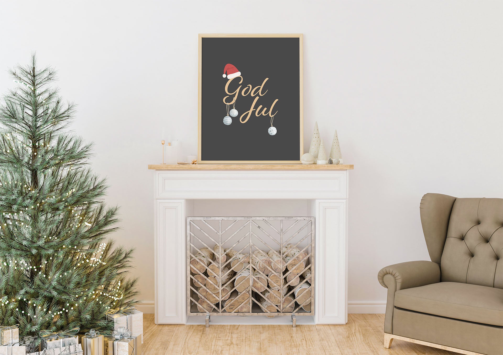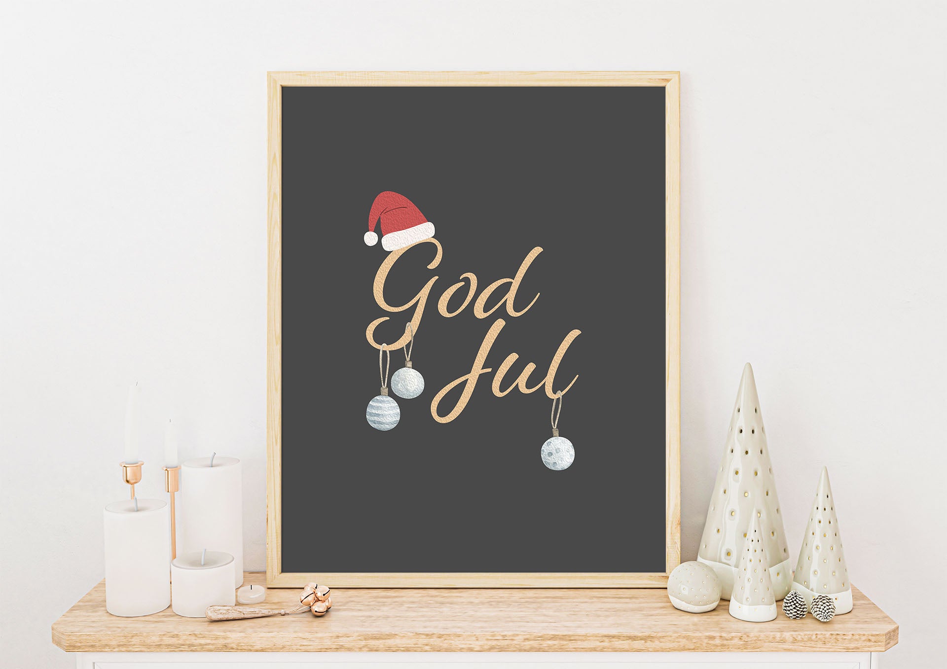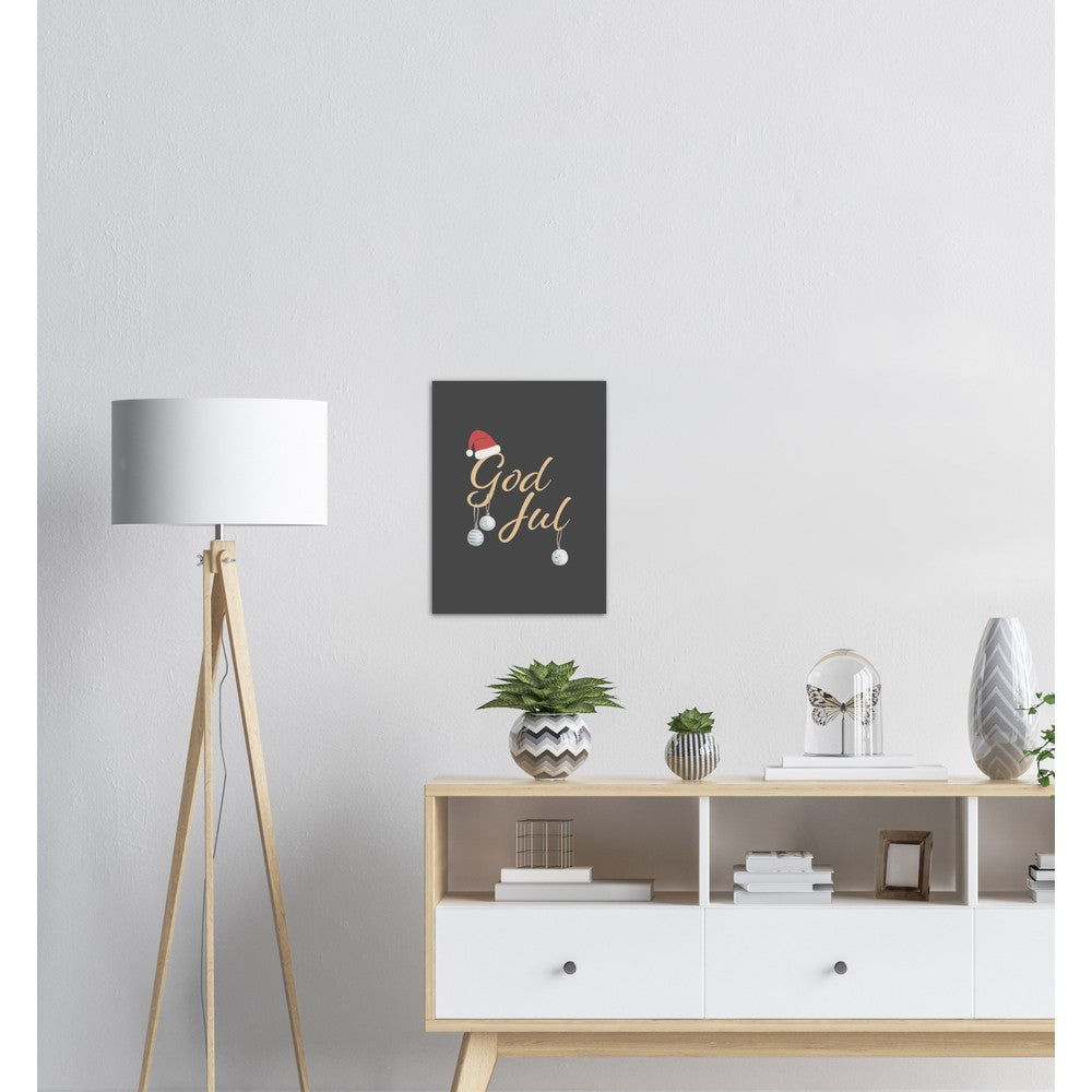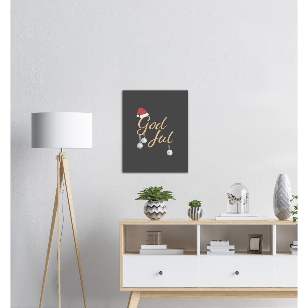 Poster med påskriften God Jul pyntet med julekuler og nisselue.