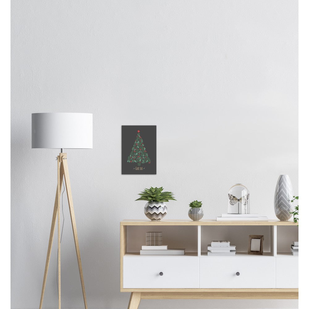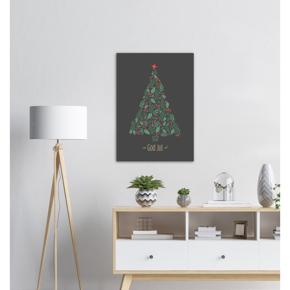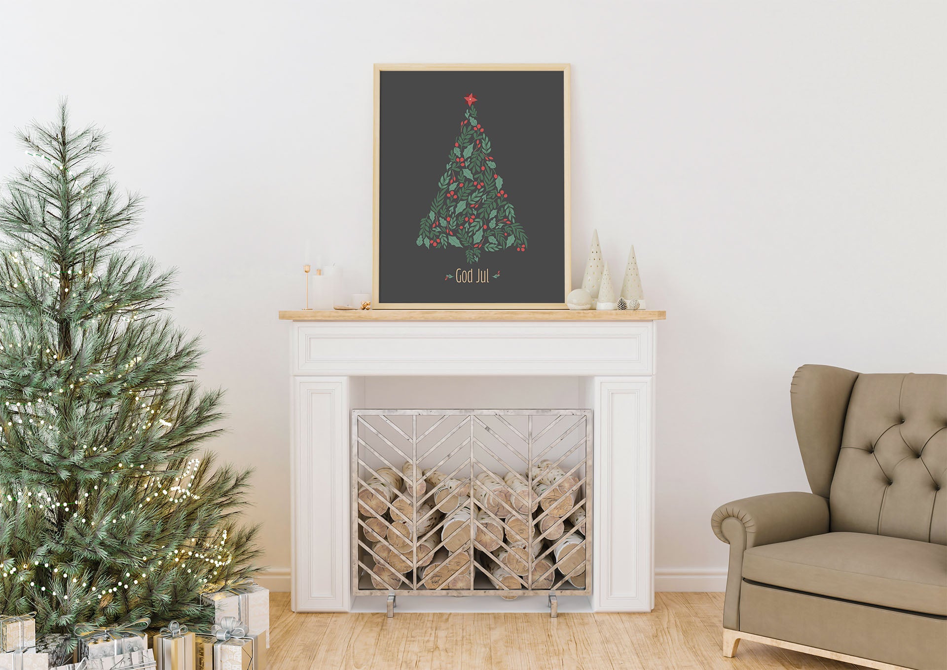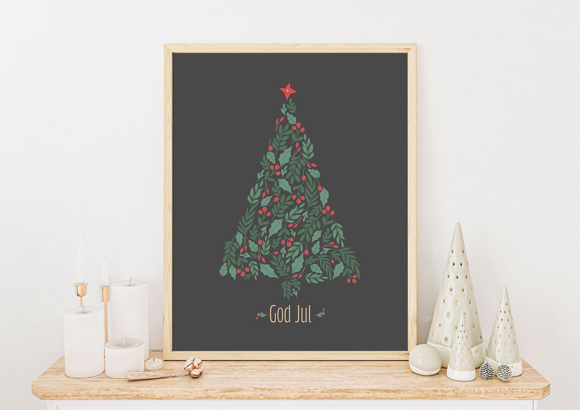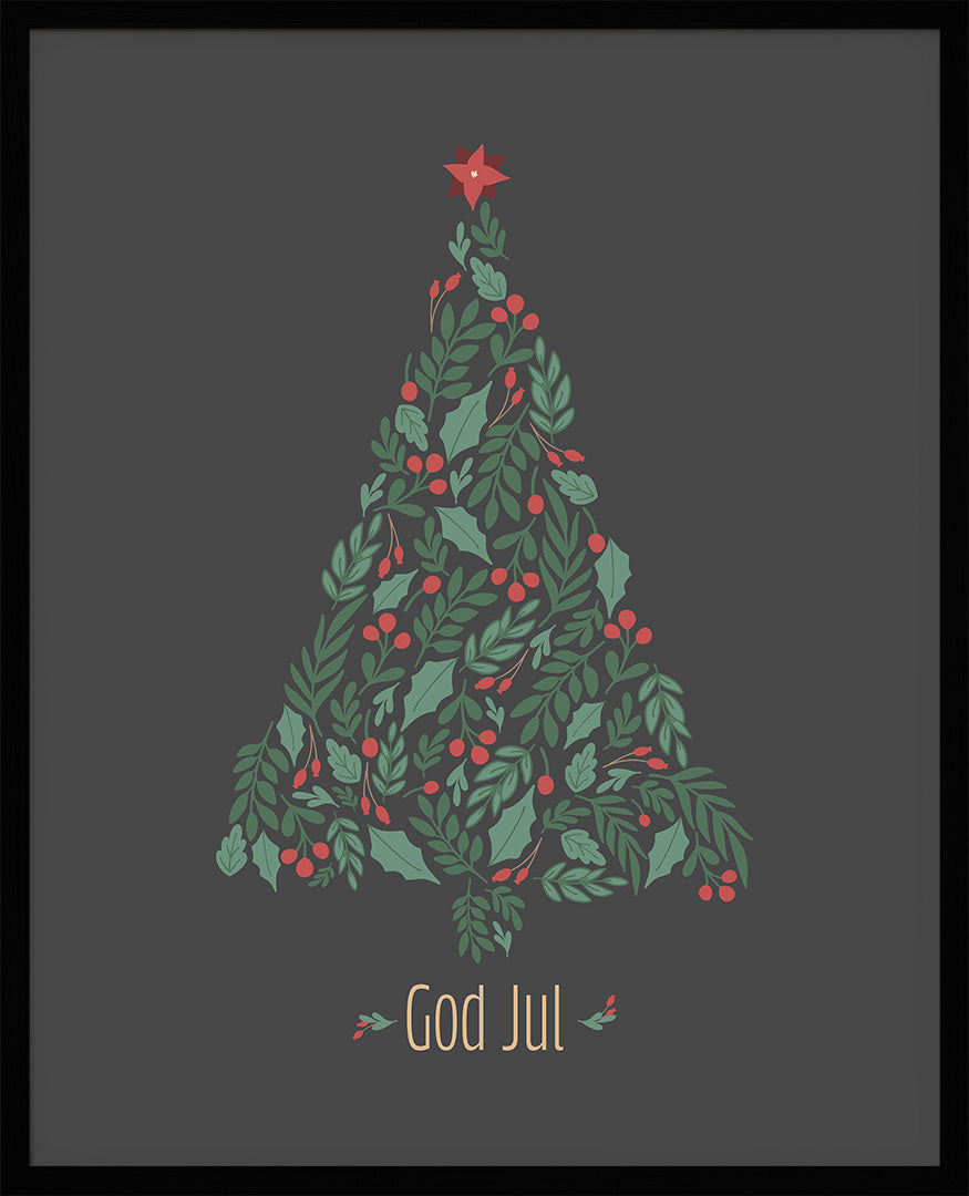Juletre satt sammen av kvister, blader og bær. Påskrift: God Jul Bakgrunnsfarge: Dempet Sort Tips: Bytt ut bildene i rammene du allerede har med plakater som julepynt.