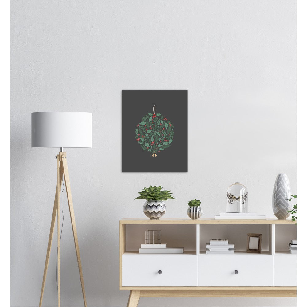 Julekule satt sammen av kvister, blader og bær. Bakgrunn: Dempet Sort