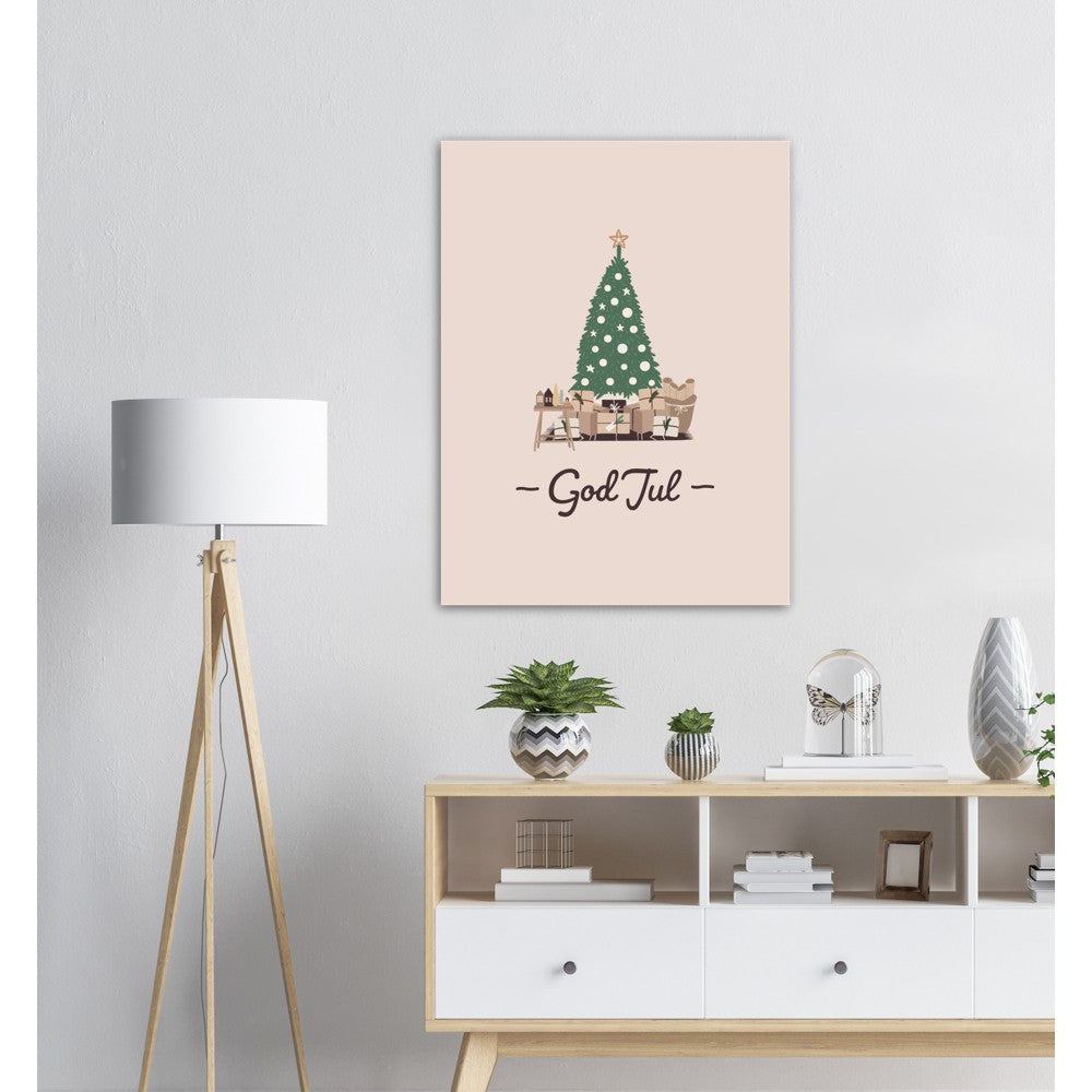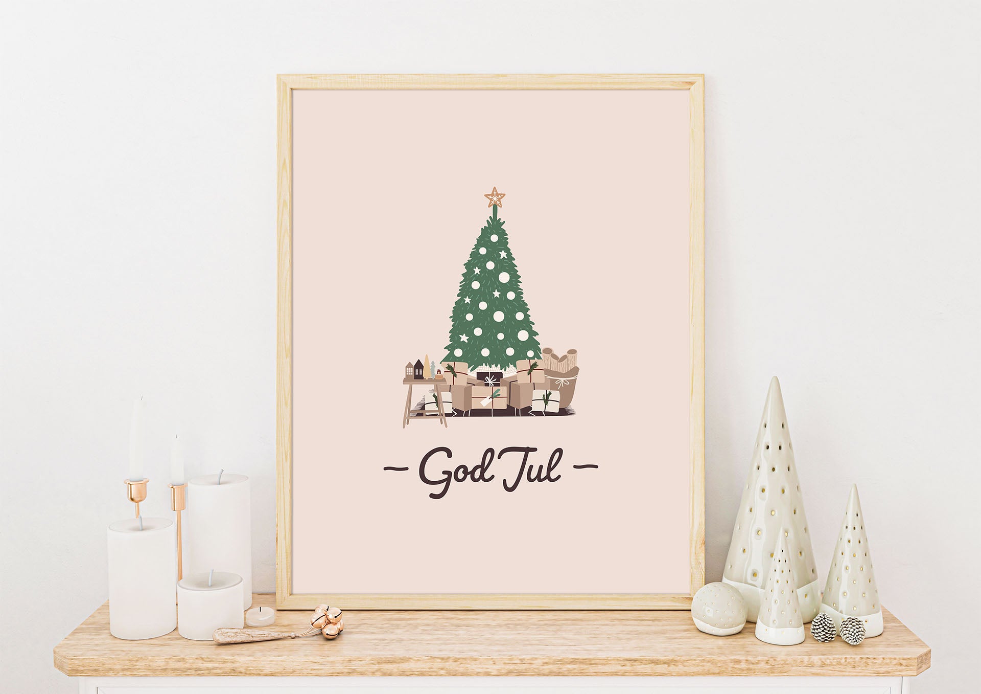Koselig juletre med masse pakker under. Tips: Bytt ut bildene i rammene du allerede har med plakater som julepynt.