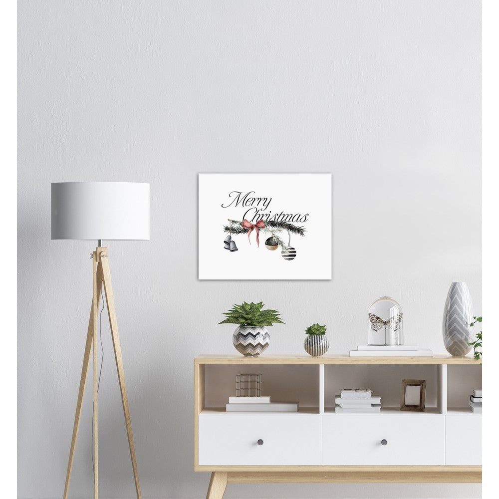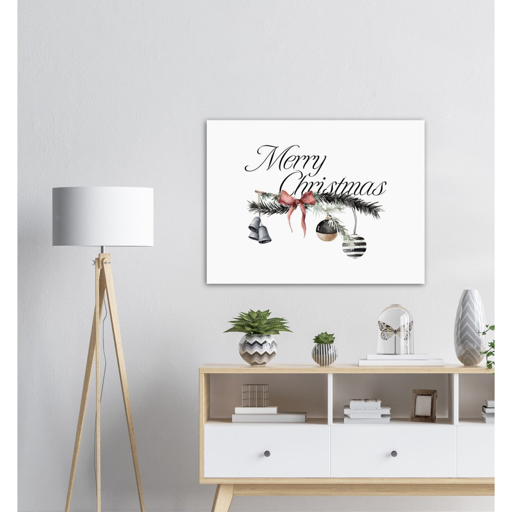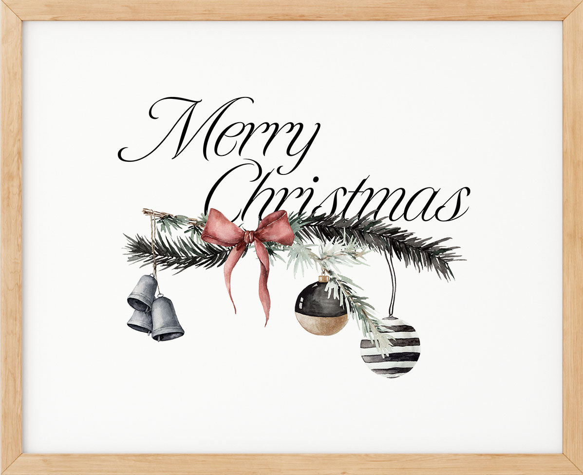 Kvist pyntet med julekuler, bjeller og sløyfe. Påskrift: Merry Christmas