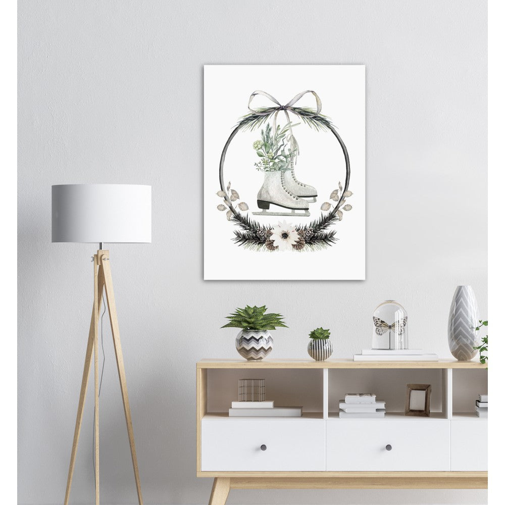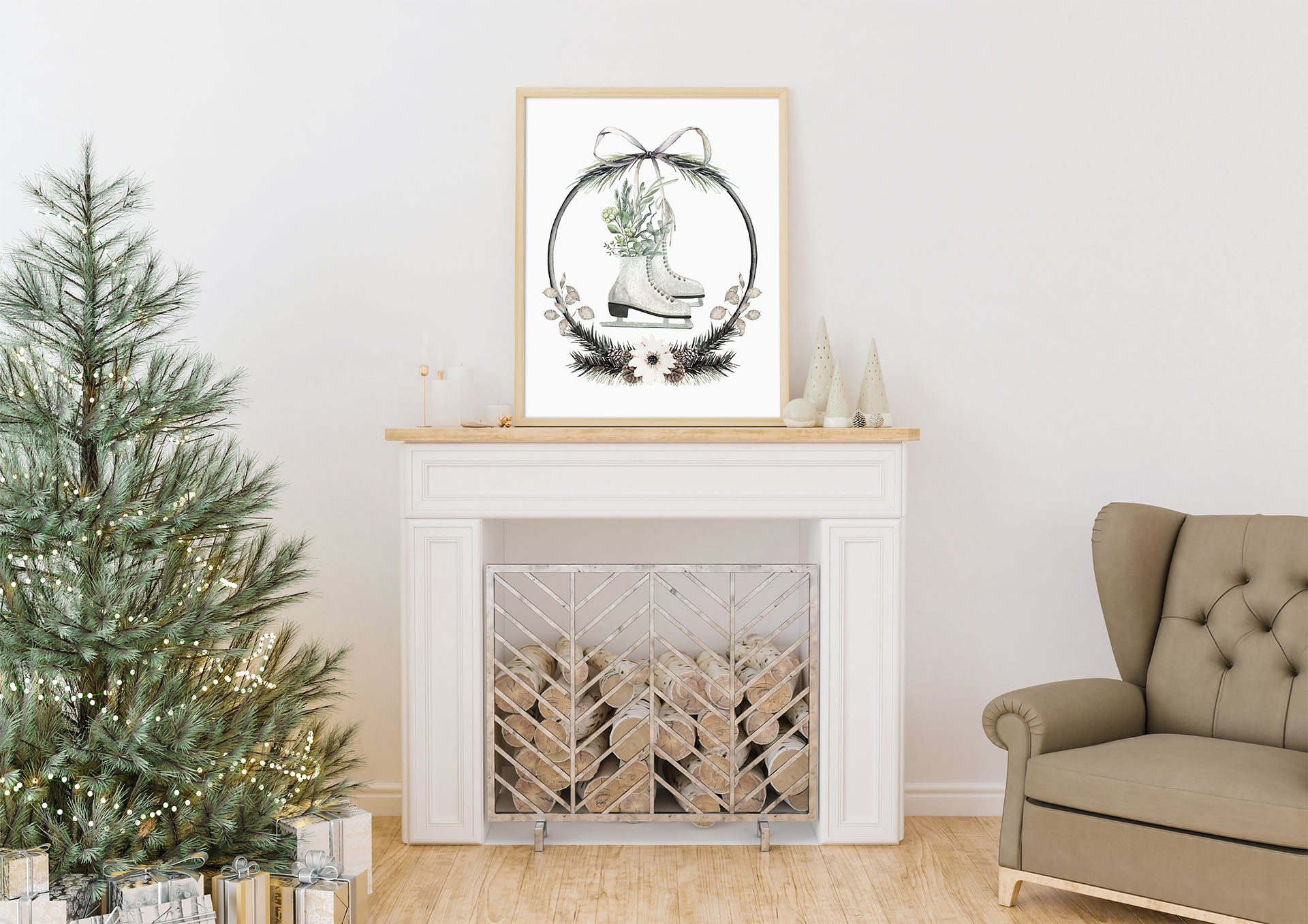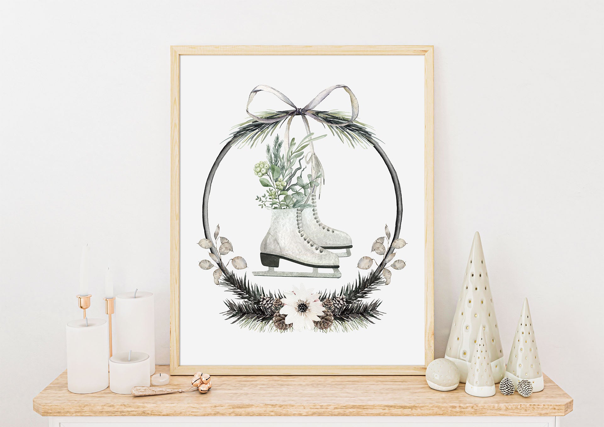 Hvite skøyter hengende i en krans. Tips: Bytt ut bildene i rammene du allerede har med plakater som julepynt.