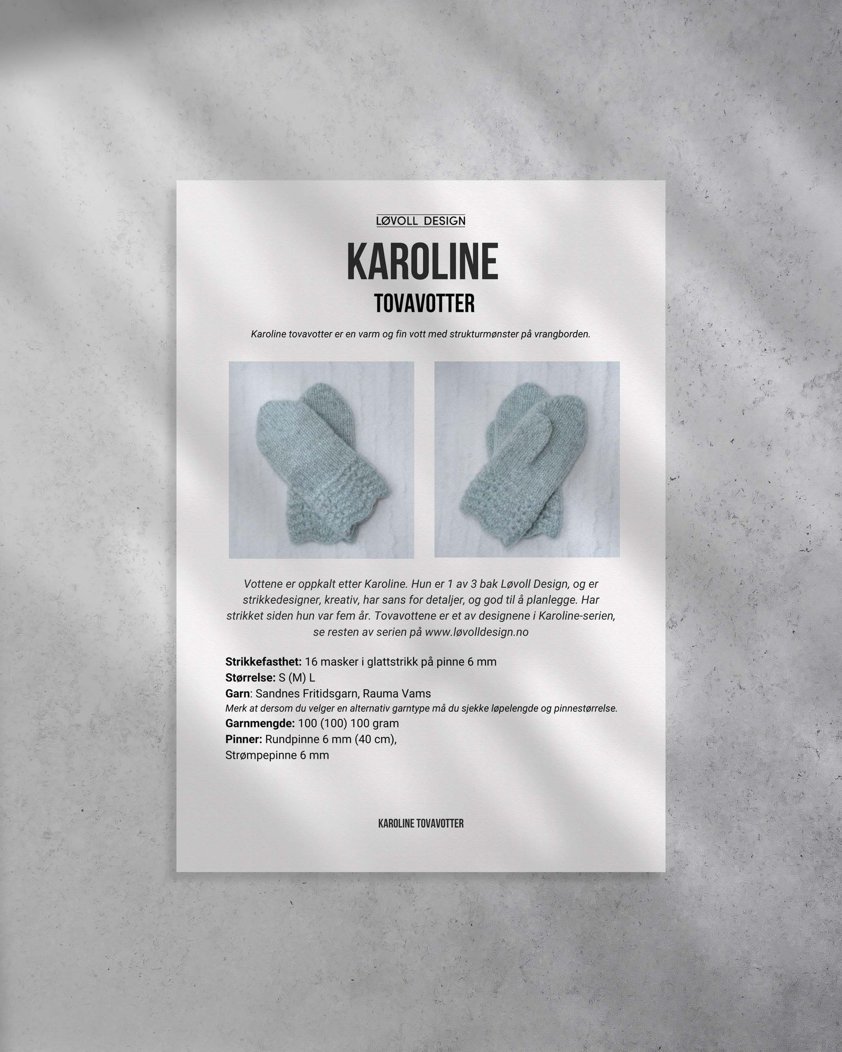 Vottene er oppkalt etter Karoline. Hun er 1 av 3 bak Løvoll Design, og er strikkedesigner, kreativ, har sans for detaljer, og god til å planlegge. Har strikket siden hun var fem år. Tovavottene er et av designene i Karoline-serien, se resten av serien på www.løvolldesign.no