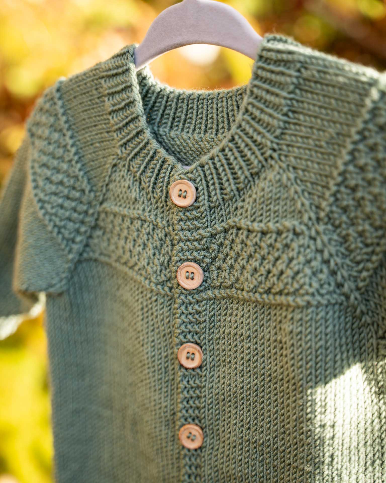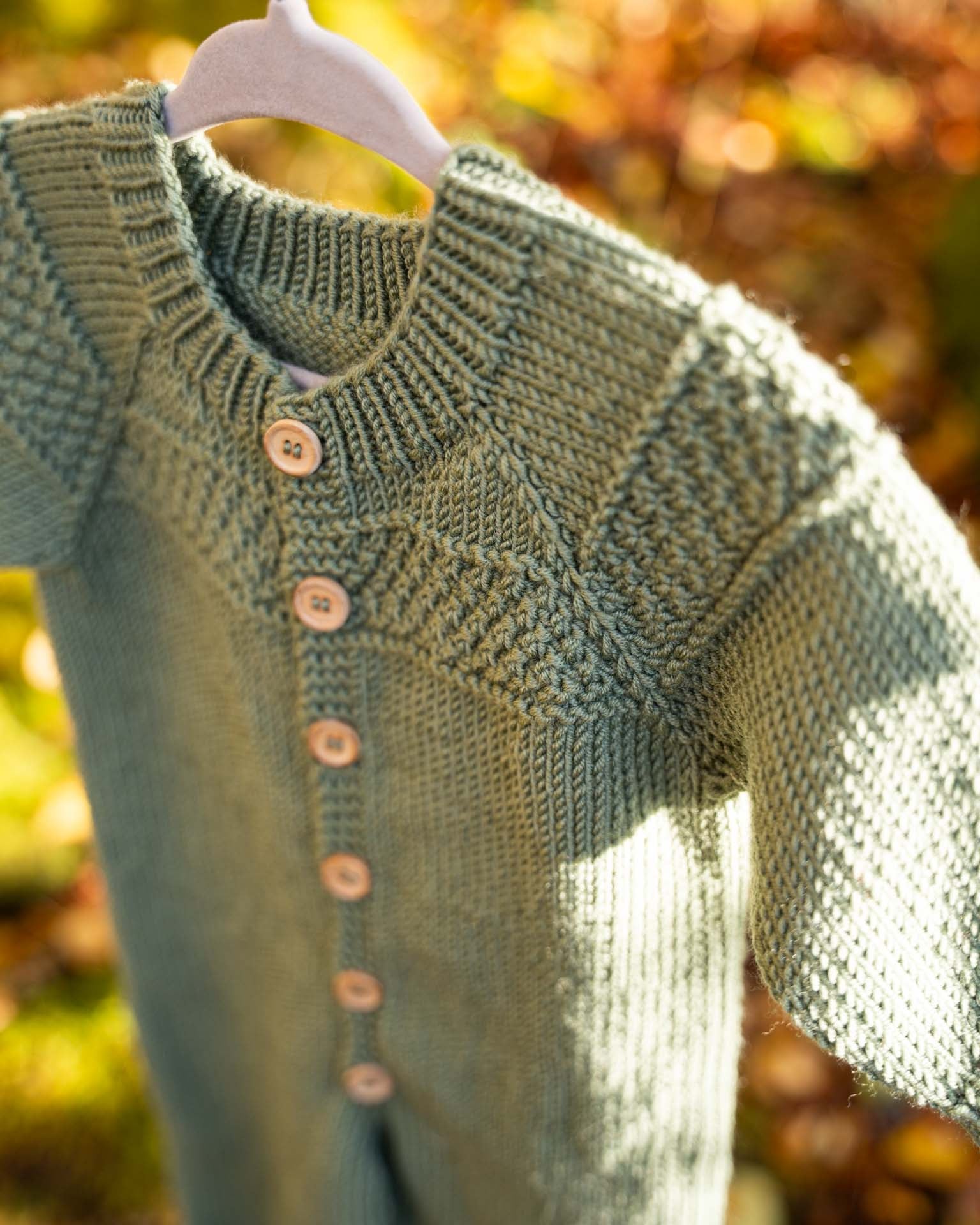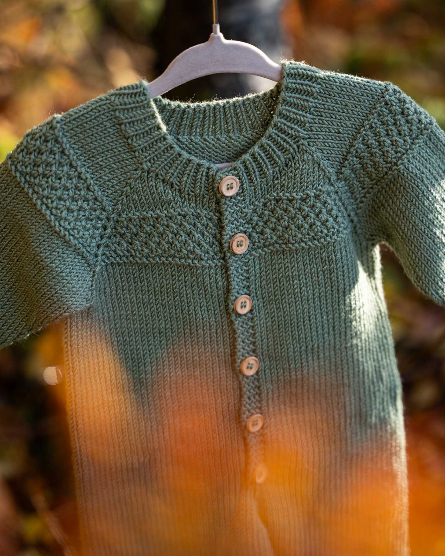 Hans babydress er en søt dress med perlestrikket bord på bærestykket. Dressen strikkes ovenfra og ned med raglanøkninger. Halsutringingen dannes ved vendepinner og stolpen strikkes i riller samtidig som resten av arbeidet. Dressen er enkel og stilfull og passer til både jenter og gutter.
